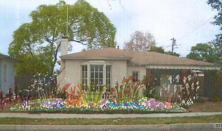The vision for the front yard path, patio and garden started with how I wanted the drought-tolerant landscape to look in front of the house.  I used a photo of the house, construction paper to add a mound, and colored pens.